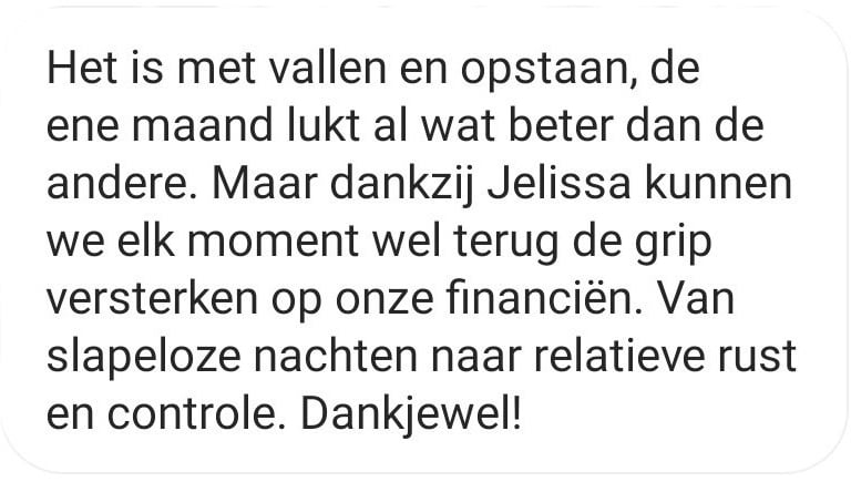 De vraag is dus meer: hoeveel maanden wil je nog verliezen zonder grip te krijgen op je geld? Hoeveel tijd en energie kost het je nu om telkens geldstress te ervaren, geen overzicht te hebben en onverwachte uitgaven op te vangen?